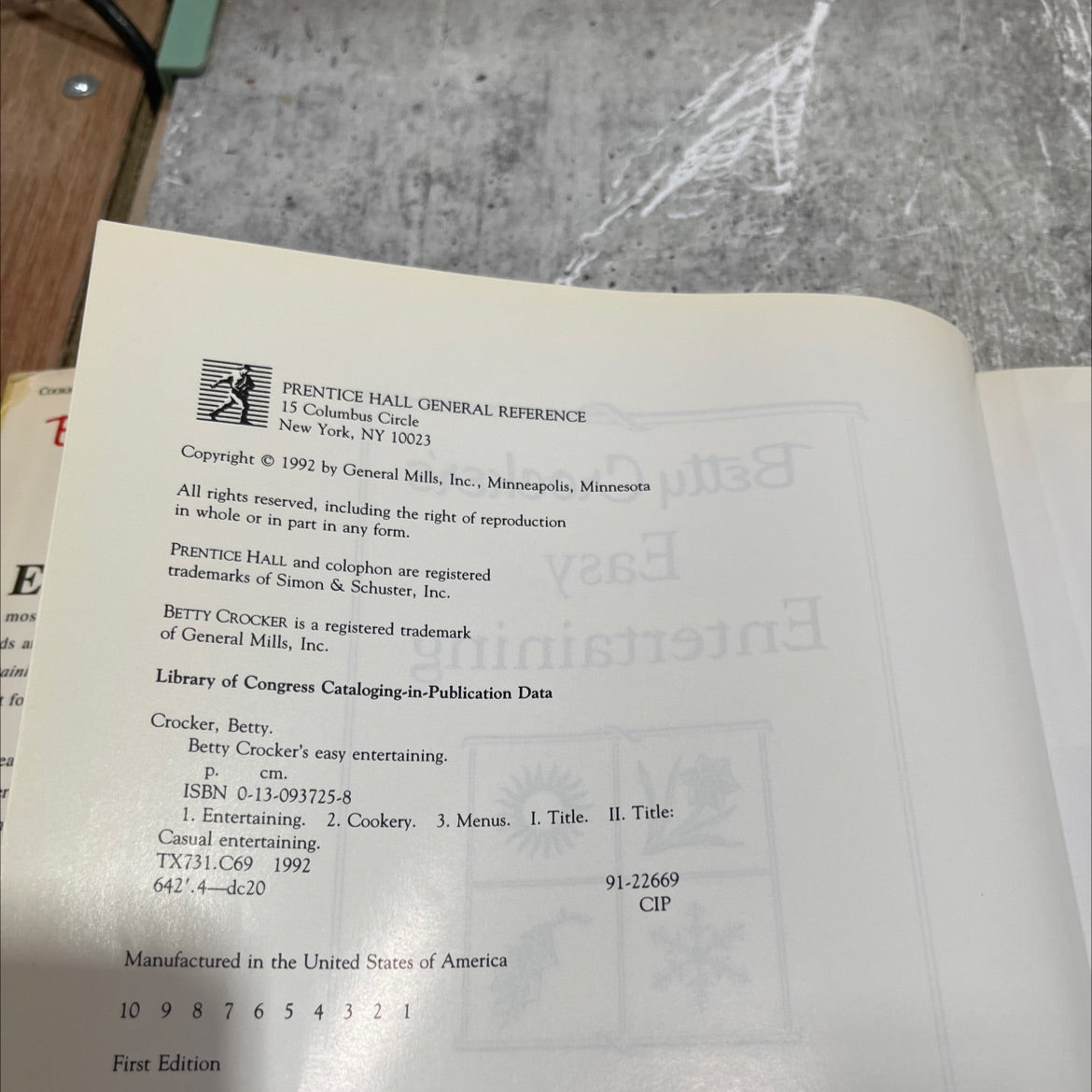Rare collectible book priced at $35, 'betty crocker's easy entertaining recipes' by julie turnbull, First Printing,unknown sold by Black Octopus Books. This book features a Hardcover binding, and was published in 1992 by prentice hall. The photos are of the EXACT copy of the book you will receive, condition and all. Here's a list of all the book stats!