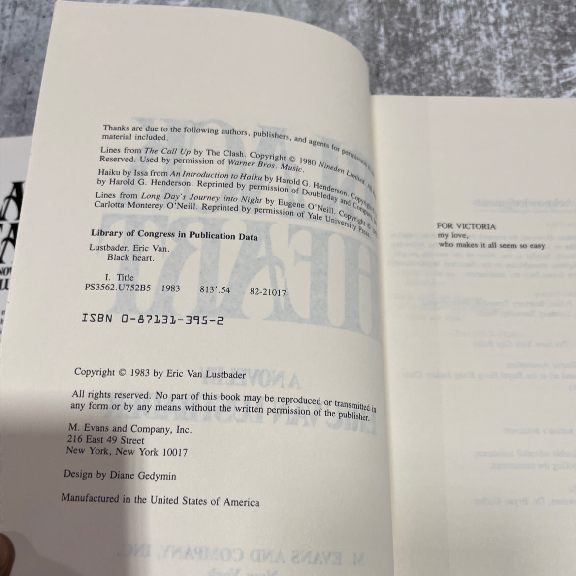 Rare collectible book priced at $35, 'black heart' by eric van lustbader, unknown printing,unknown sold by Black Octopus Books. This book features a Hardcover binding, and was published in 1983 by m. evans and company, inc.. The photos are of the EXACT copy of the book you will receive, condition and all. Here's a list of all the book stats!
