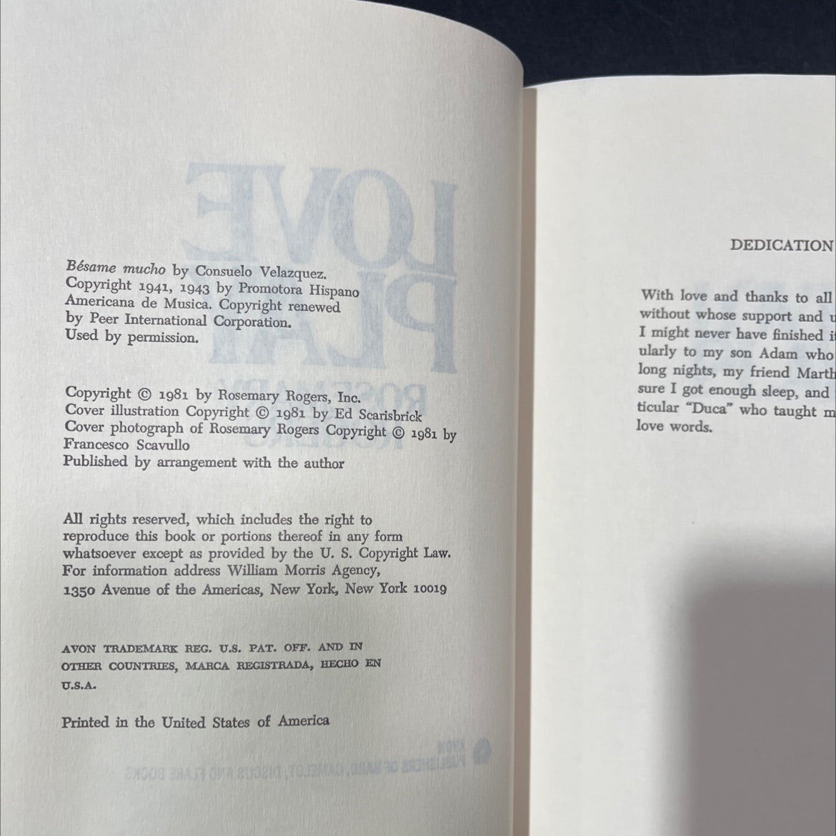 Rare collectible book priced at $19.99, 'love play' by rosemary rogers, unknown printing,unknown sold by Black Octopus Books. This book features a Hardcover binding, and was published in 1981 by avon. The photos are of the EXACT copy of the book you will receive, condition and all. Here's a list of all the book stats!
