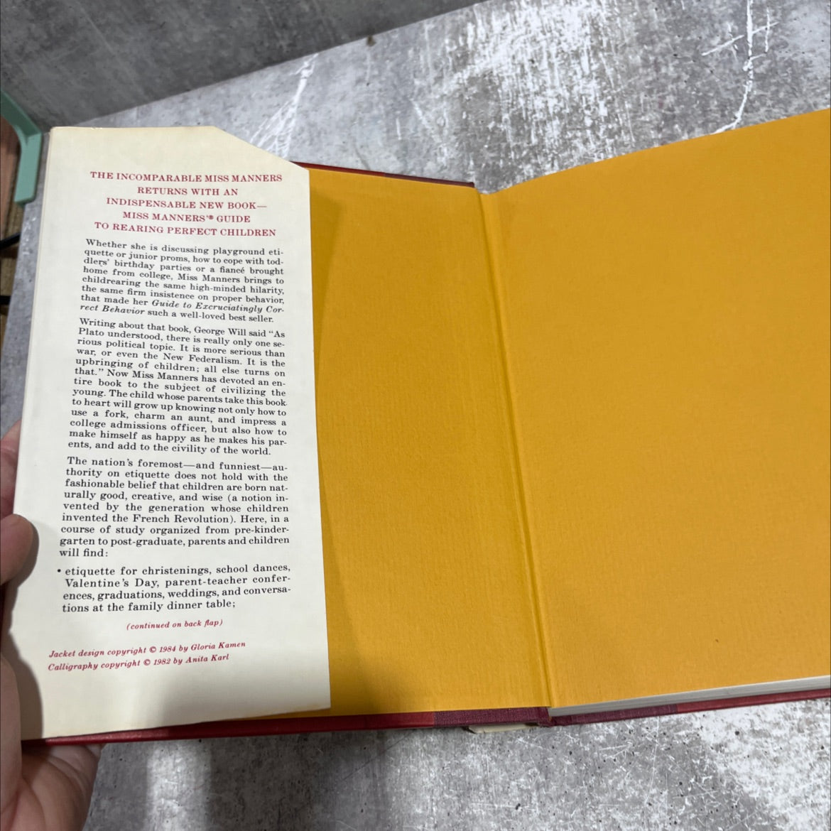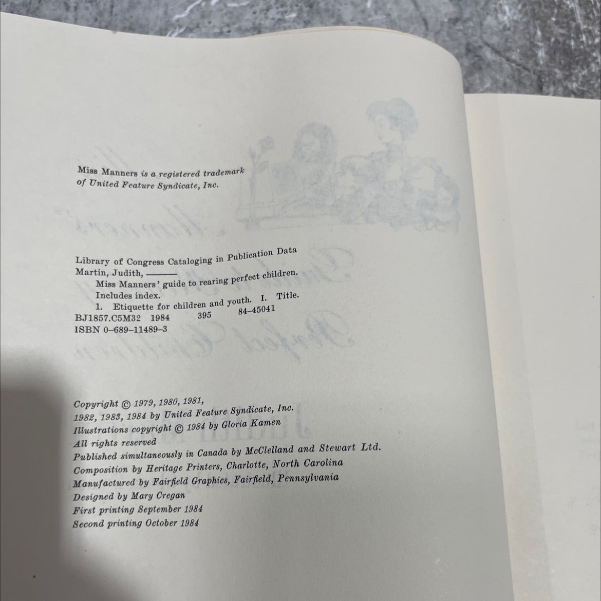 Rare collectible book priced at $35, 'miss manners' guide to rearing perfect children' by Judith Martin, First Printing,unknown sold by Black Octopus Books. This book features a Hardcover binding, and was published in 1984 by Atheneum. The photos are of the EXACT copy of the book you will receive, condition and all. Here's a list of all the book stats!