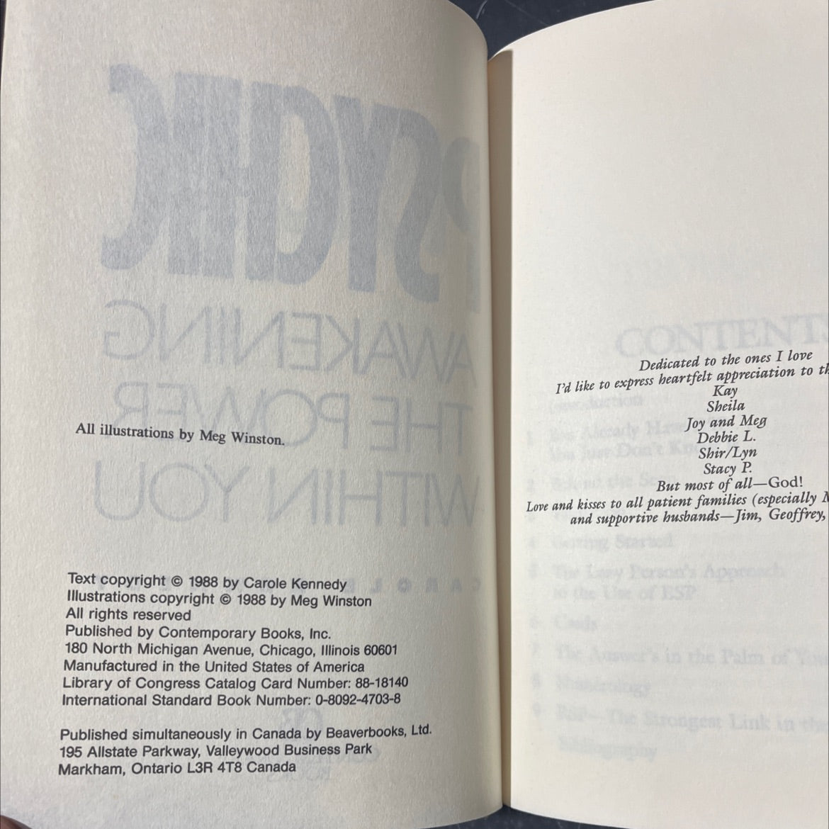 Rare collectible book priced at $35, 'psychic awakening the power within you' by carole kennedy, unknown,unknown sold by Black Octopus Books. This book features a Hardcover binding, and was published in 1988 by Contemporary Books, Inc.. The photos are of the EXACT copy of the book you will receive, condition and all. Here's a list of all the book stats!