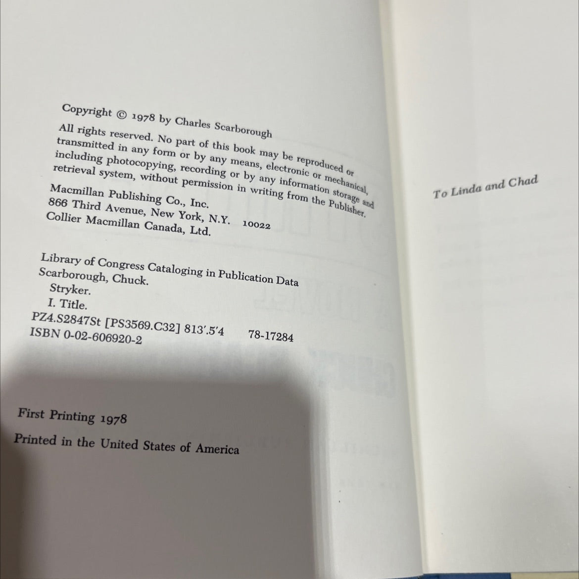 Rare collectible book priced at $35, 'stryker' by chuck scarborough, First Printing,unknown sold by Black Octopus Books. This book features a Hardcover binding, and was published in 1978 by Macmillan Publishing Co., Inc.. The photos are of the EXACT copy of the book you will receive, condition and all. Here's a list of all the book stats!