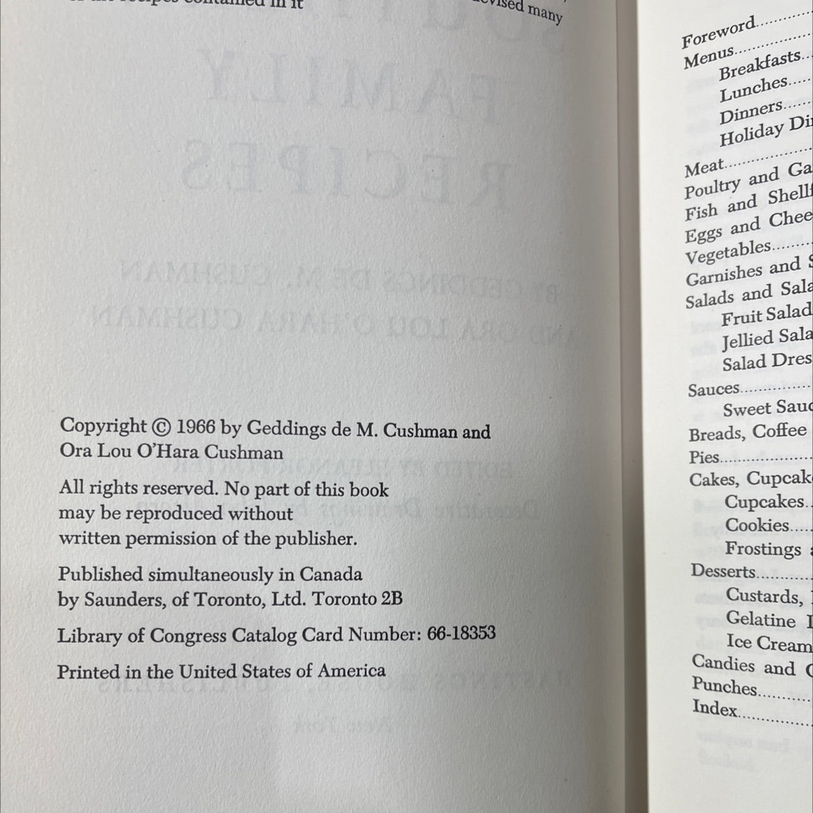 Rare collectible book priced at $35, 'treasured southern family recipes' by geddings de m. cushman and ora lou o'hara cushman, unknown,unknown sold by Black Octopus Books. This book features a Hardcover binding, and was published in 1966 by hastings house, publishers. The photos are of the EXACT copy of the book you will receive, condition and all. Here's a list of all the book stats!