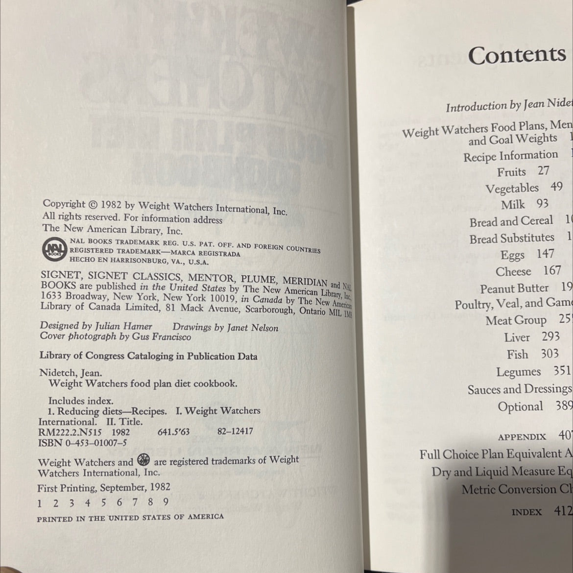 Rare collectible book priced at $35, 'weight watchers food plan diet cookbook' by jean nidetch, First Printing,unknown sold by Black Octopus Books. This book features a Hardcover binding, and was published in 1982 by The New American Library, Inc.. The photos are of the EXACT copy of the book you will receive, condition and all. Here's a list of all the book stats!